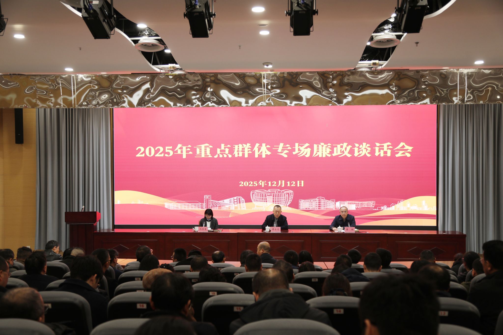 2025年12月12日,学校2025年重点群体专场廉政谈话会在会议中心大报告厅举行。此次会议为学校2025年分层分类全覆盖廉政谈话的一项重要内容,校党委书记黄永忠讲话,省纪委监委驻内江师范学院纪检监察组组长、党委副书记、纪委书记冯雪莲同志作廉政谈话。会议由校党委副书记黄辉主持。